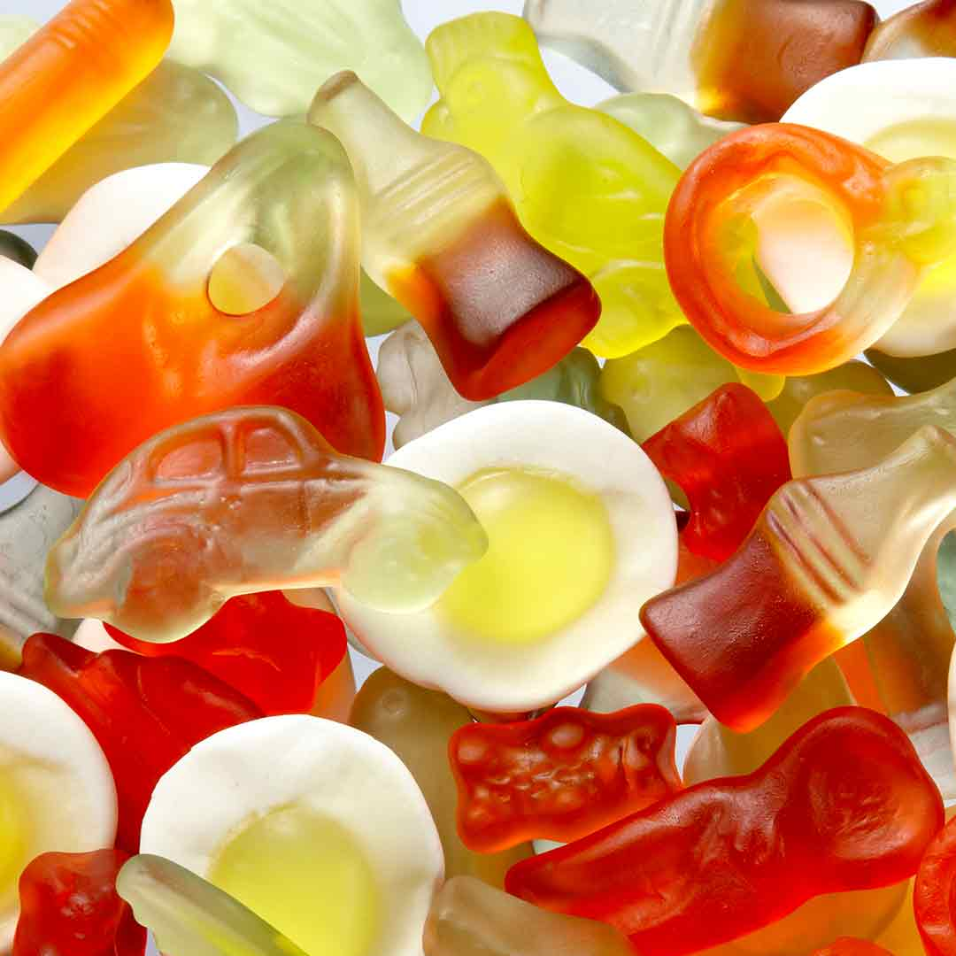 Glükózszirup, cukor, zselatin, dextróz, citromsav, gyümölcs- és növényi koncentrátumok (spirulina, sáfrány, alma, citrom, retek, édesburgonya, répa, feketeribizli, hibiszkusz), aroma, karamellszirup, napraforgóolaj, felületkezelő anyagok (fehér méhviasz, sárga méhviasz), karnaubaviasz.
